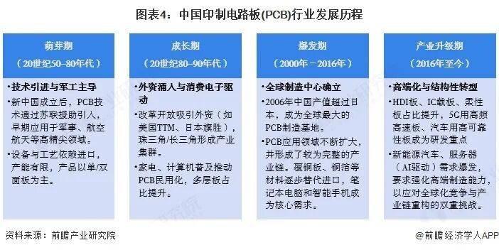 中邦经济的急迅延长和通讯、策画机等下业的高速兴盛为印制电途板(PCB)的急迅兴盛和渗出率的晋升供给了有力援手。自起步至今,中邦印制电途板行业从“跟跑”到“并跑”,逐渐打破“卡脖子”闭键,合座来看,其兴盛过程大致可分为四个阶段:萌芽、发展、产生以及物业升级期。