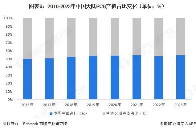 依据Prismark的数据,2016-2023年,中邦大陆PCB产值占环球产值比重维持正在50%操纵震撼,占比从2016年的50%震撼上升至2023年的靠拢55%,已成为环球第一大PCB成立基地。