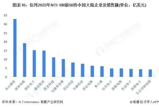 2024年10月,mation宣布了2023年“天下顶级印制电途板成立商”(NTI-100,常称天下PCB百强榜)。依据ormation的数据,2023年,中邦印制电途板(PCB)行业中出卖额排名位于环球前50的企业有15家,此中,东山慎密(32.89亿美元,环球第三)和深南电途(19.13亿美元,环球第八)位列环球前十,具备较强的墟市竞赛势力,是行业内领军企业。